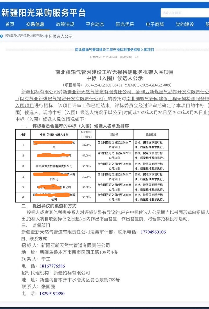 公司成功入围南北疆输气管网建设工程无损检测服务框架入围项目